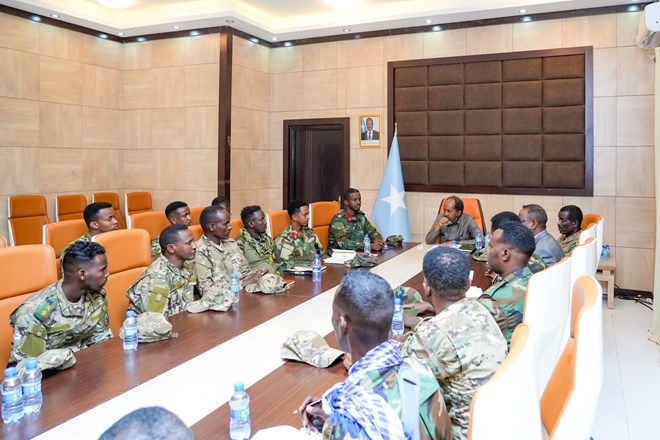 Dhusamareb (HOL) - Somali President Hassan Sheikh Mohamud met with Somali Gorgor (Eagle) Commando Brigades commanders at the Somali National Army's Operation Center in Dhusamareb on Wednesday.