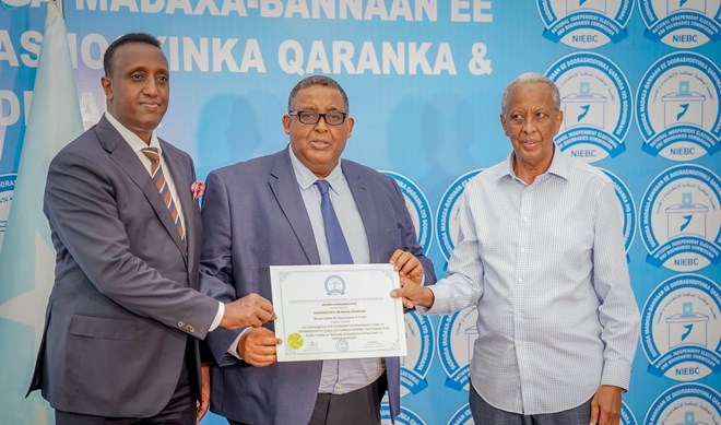 Former Somali Prime Minister Omar Abdirashid Ali Sharmarke, center, receives a certificate of registration for his political party from the National Independent Electoral Commission in Mogadishu, Somalia. The commission registered 14 new parties.