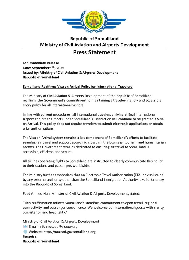 The Ministry of Civil Aviation and Airports announced that visitors will still be able to obtain visas upon arrival at Hargeisa’s Egal International Airport, where the policy has long been in effect. Officials said the decision was aimed at supporting business travel, tourism, humanitarian work, and broader economic growth.
