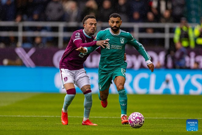 Liverpool's Mohamed Salah (R) vies for the ball during the English Premier League match between Burnley FC and Liverpool FC in Burnley, Britain, on Sept. 14, 2025. (Xinhua)